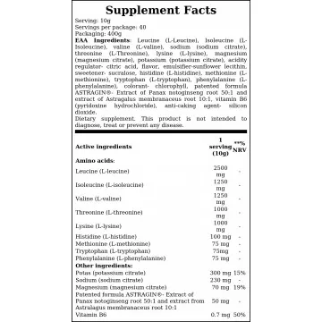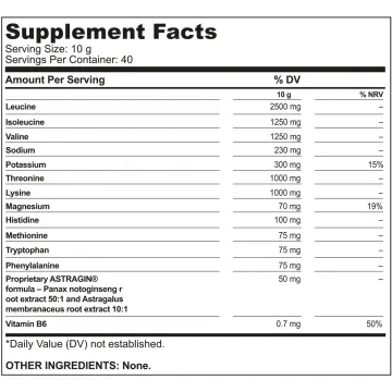 Πλήρες συμπλήρωμα EAA (Essential Amino Acids) που υποστηρίζει την αποκατάσταση, την ανάπτυξη μυϊκής μάζας και την απόδοση.