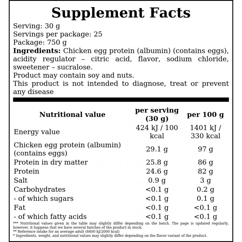 Egg Albumin (πρωτεΐνη αυγού), γλυκαντικό (π.χ. σουκραλόζη / στεβιόλη), αρωματικές ύλες, ρυθμιστής οξύτητας (κιτρικό οξύ).