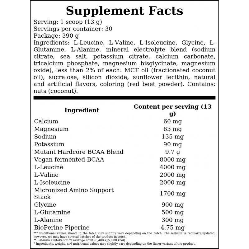 Υψηλή δόση BCAA 2:1:1 (Leucine, Isoleucine, Valine) για μυϊκή ανάπτυξη, προστασία από καταβολισμό και ταχεία αποκατάσταση. ~30 μερίδες / 390 g. Χωρίς ζάχαρη, ιδανικό intra-workout.