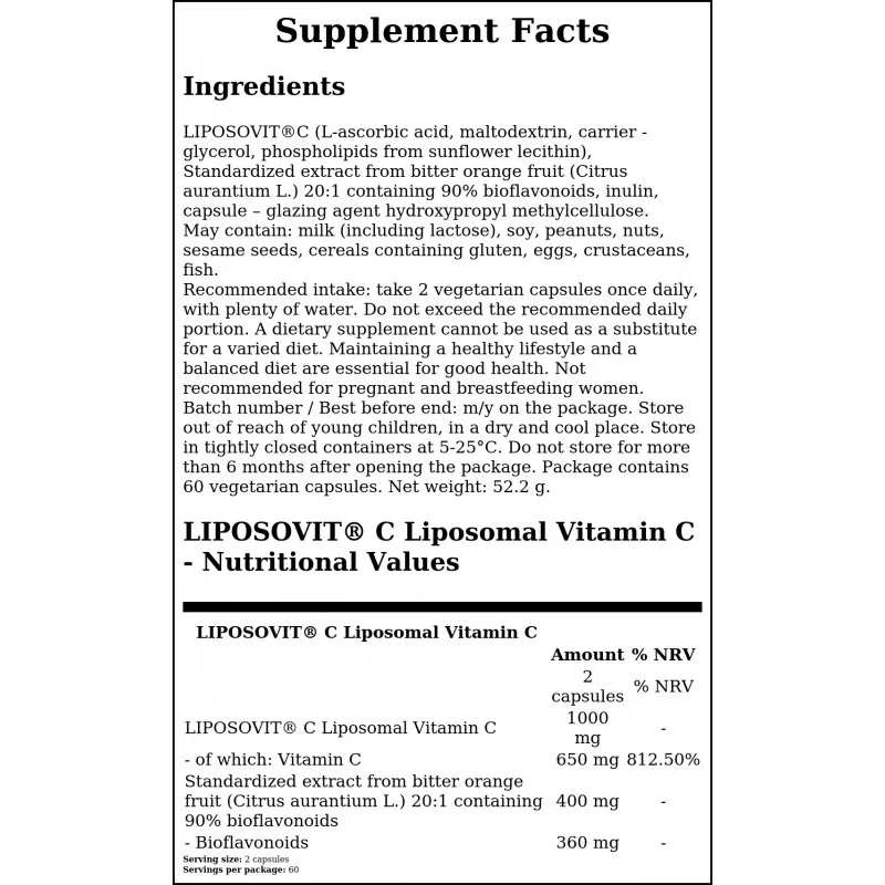 Liposovit®-C (L-ασκορβικό οξύ σε λιποσωμιακή μορφή), μαλτοδεξτρίνη, φωσφολιπίδια ηλιέλαιου, εκχύλισμα Citrus aurantium (βιοφλαβονοειδή), φυτική κάψουλα (HPMC).