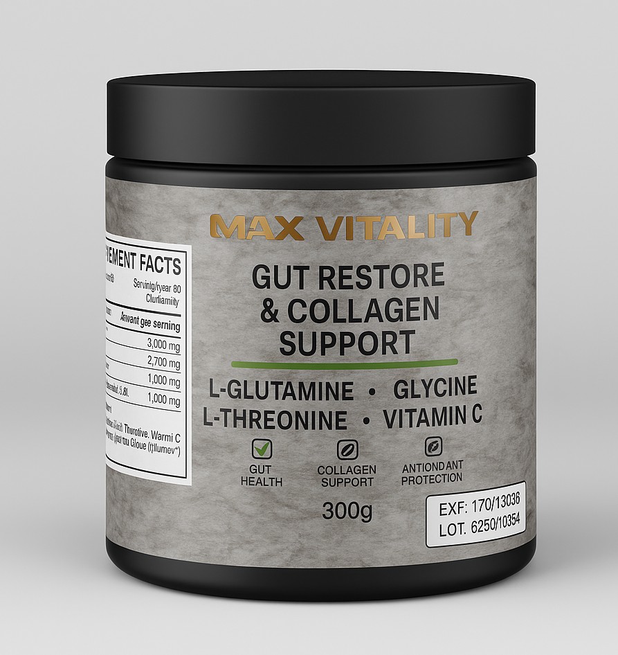 Το Max Vitality Gut Restore & Collagen Support είναι ένα προηγμένο συμπλήρωμα αμινοξέων, ειδικά σχεδιασμένο για: