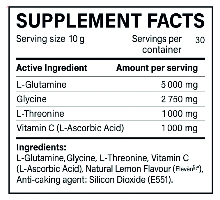 Η φόρμουλα περιέχει L-Glutamine, Glycine, L-Threonine και Vitamin C σε κλινικά αποτελεσματικές δόσεις, ενώ η γεύση Lemon με ElevenFit® προσφέρει εξαιρετική διαλυτότητα και φρεσκάδα χωρίς ζάχαρη.