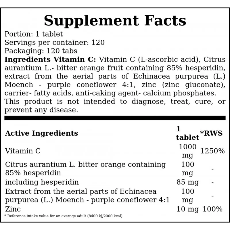 Η συγκεκριμένη φόρμουλα συνδυάζει 1000mg καθαρής βιταμίνης C (ασκορβικό οξύ) με φυσικά citrus bioflavonoids, τα οποία ενισχύουν την απορρόφηση και την αντιοξειδωτική δράση της βιταμίνης C. Τα βιοφλαβονοειδή συνεργάζονται με τη βιταμίνη C, αυξάνοντας τη σταθερότητα και την αποτελεσματικότητά της στον οργανισμό.
